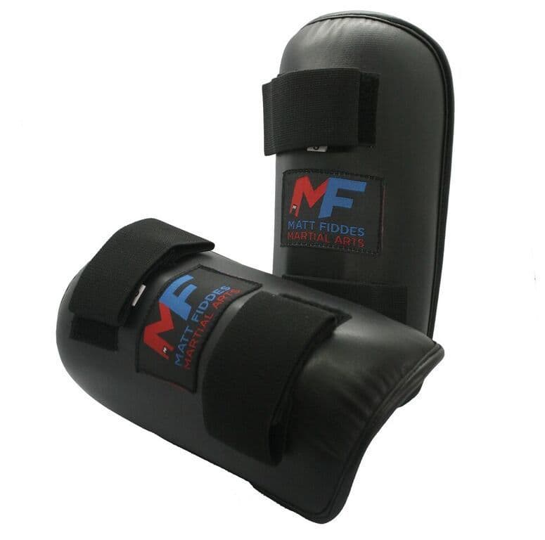 Matt Fiddes shin protection, with logo, in black. Made of PU leather inside, high density foam padding with elastic velcro round.